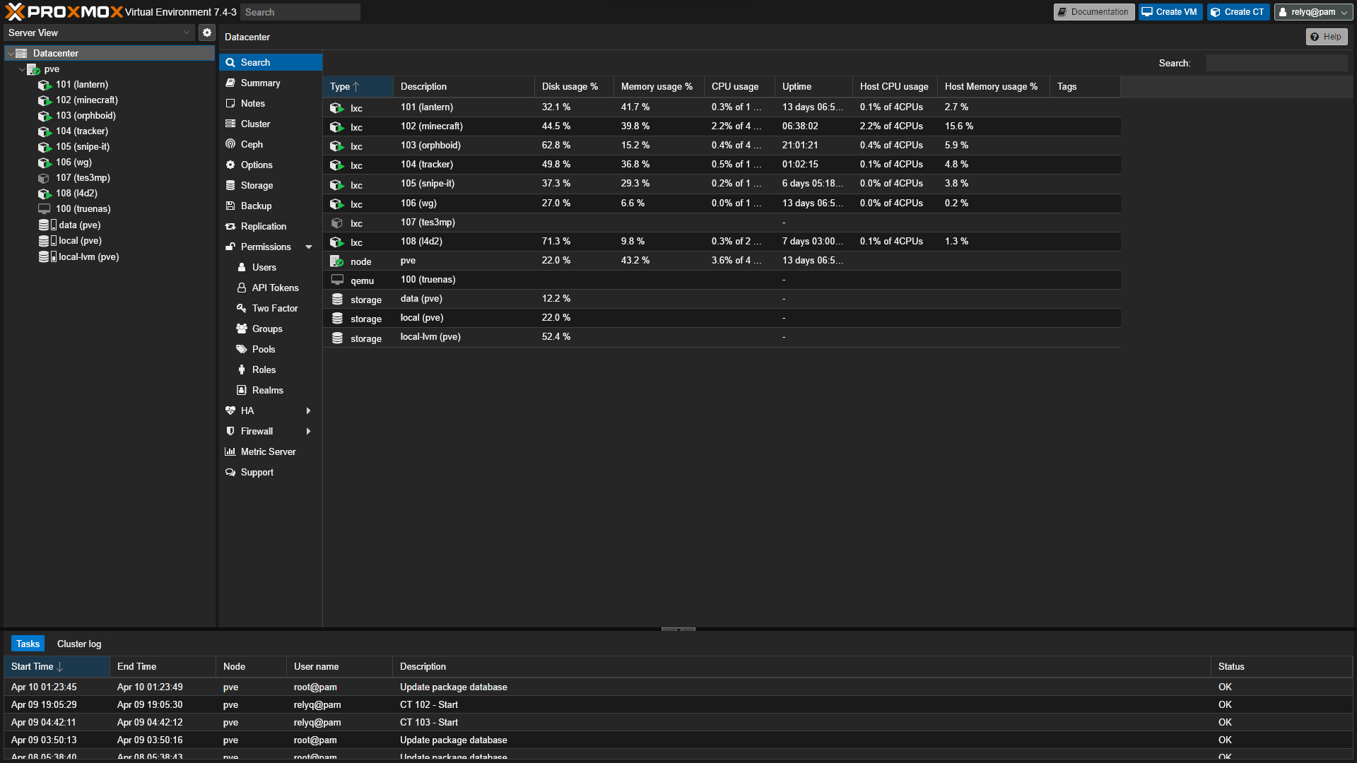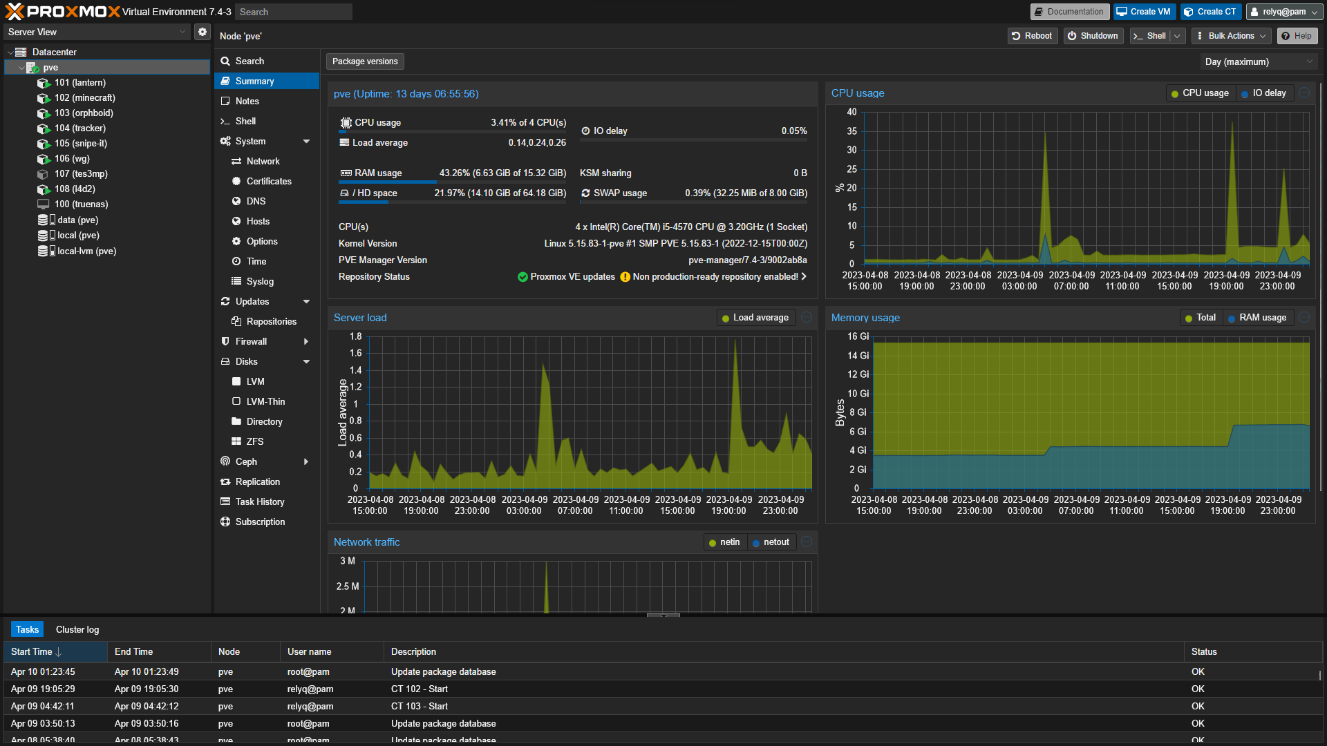 it runs proxmox ve and hosts a wireguard vpn, a truenas vm, the api & db for my issue tracker, a snipe-it instance, my discord bot, and various game servers, each service on its own linux container